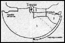 Making the tripod: Lay your canvas out flat with the inside facing down. Lay two stocky poles, across the centre, from the tongue to the edge of the canvas. The butts of the poles should stick out about nine inches from the canvas edge. Take a third stocky pole, the door pole, and lay it as shown, so that it crosses the first two poles at the bottom of the tongue, again the butt sticking out nine inches. The door pole is then swung around on top of the first two whilst someone holds it in place at the crossing point. Usually the butt of the door pole sticks out further than the others, by about 12 -15 inches. The three poles are tied at the crossing point with one end of the anchor rope First do a clove hitch and then wind the short end of the rope around the poles twice and tie off to the long end with a reef knot. The prevailing wind in Britain generally comes from the South-West, so the tipi is pitched facing away from this, usually towards the East. However when you go somewhere new check and find out where the wind generally comes from and pitch accordingly, you do not want the wind coming in the door. Move your tripod bundle to the back of your pitching spot and,assuming your door will face East put them down with the butts in the South, the tips of the poles pointing North. The door pole (D) should still be on top of the bundle so take the butt of it and carefully swing it to the East. | |||||||||||||||||||||||||||||||||||||||||