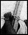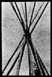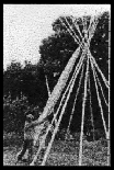 them from being trapped. Then, with someone holding the tongue take one corner of the door strip and fold it to the centre . Do the same on the other side and repeat until the bundle is about three feet wide at the bottom. Roll the whole bundle over and now you have the inside of the cover upwards and the canvas showing is the centre of the back of the cover where the lifting pole will be. Pull the canvas flat between the tongue and the bottom of the back of the cover and place the sturdy lifting pole on top. Have the butt sticking out 9 inches from the bottom of the cover. Lash the tongue onto the pole. The bundle with pole on top is then laid down at the back of the framework with the butt of the lifting pole in the space which was left between the two back poles. The pole and cover is lifted in the same way as the tripod - someone puts their foot on the | |||||||||||||||||||||||||||||||||||||||||