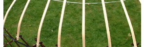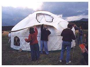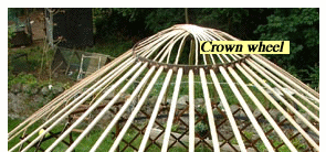 Yurt Framework The woodwork of a yurt comprises of four main elements :- Trellis wall - this is made in two or three sections depending on the size of the yurt. The individual laths are cut to size, drilled, steamed to shape, sanded, oiled and then knotted to each other to form a trellis panel. The panels are tied to each other and the uprights of the door frame. A tension band is fitted around the walls from one door post to the other. Door frame - this is made in four pieces, the uprights fittng snuggly into the top and bottom pieces to give a rigid frame. Rafters - these are all steam bent in the same former to give an elegant uniform shape to the yurt. They are tied to the top of the side walls and socketed into the crown wheel. They are laced to each other giving the framewok remarkable stability. Crown wheel - this is technically the most difficult part of the yurt to make. The rim is steam bent to shape, tapered sockets are cut for each rafter and then spars are steam bent and fitted in a traditional pattern. | ||||||||||